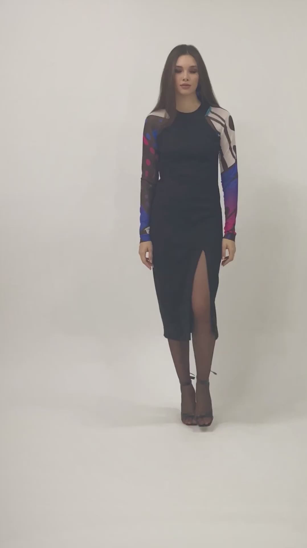 Vestido leve a médio, comprimento midi, levemente ajustado ao corpo, com fenda na lateral. Sai na versão lisa e com faixa vertical nas costas.