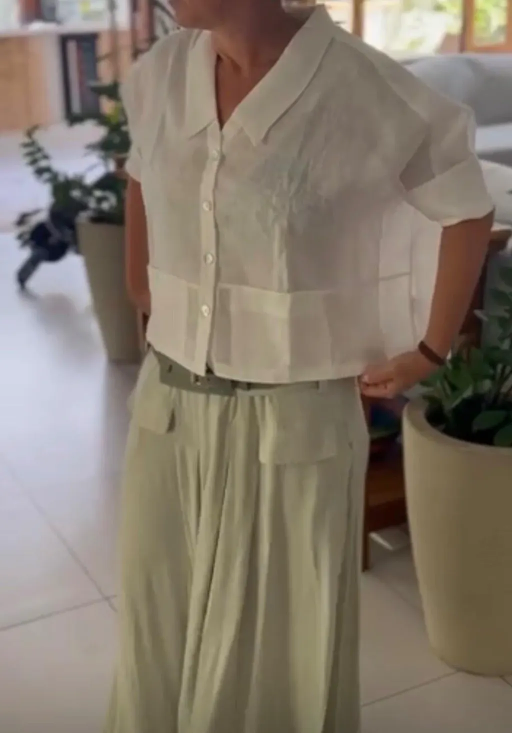 Modelagem: Solta, de corte reto e comprimento levemente encurtado, criando uma silhueta moderna e versátil.