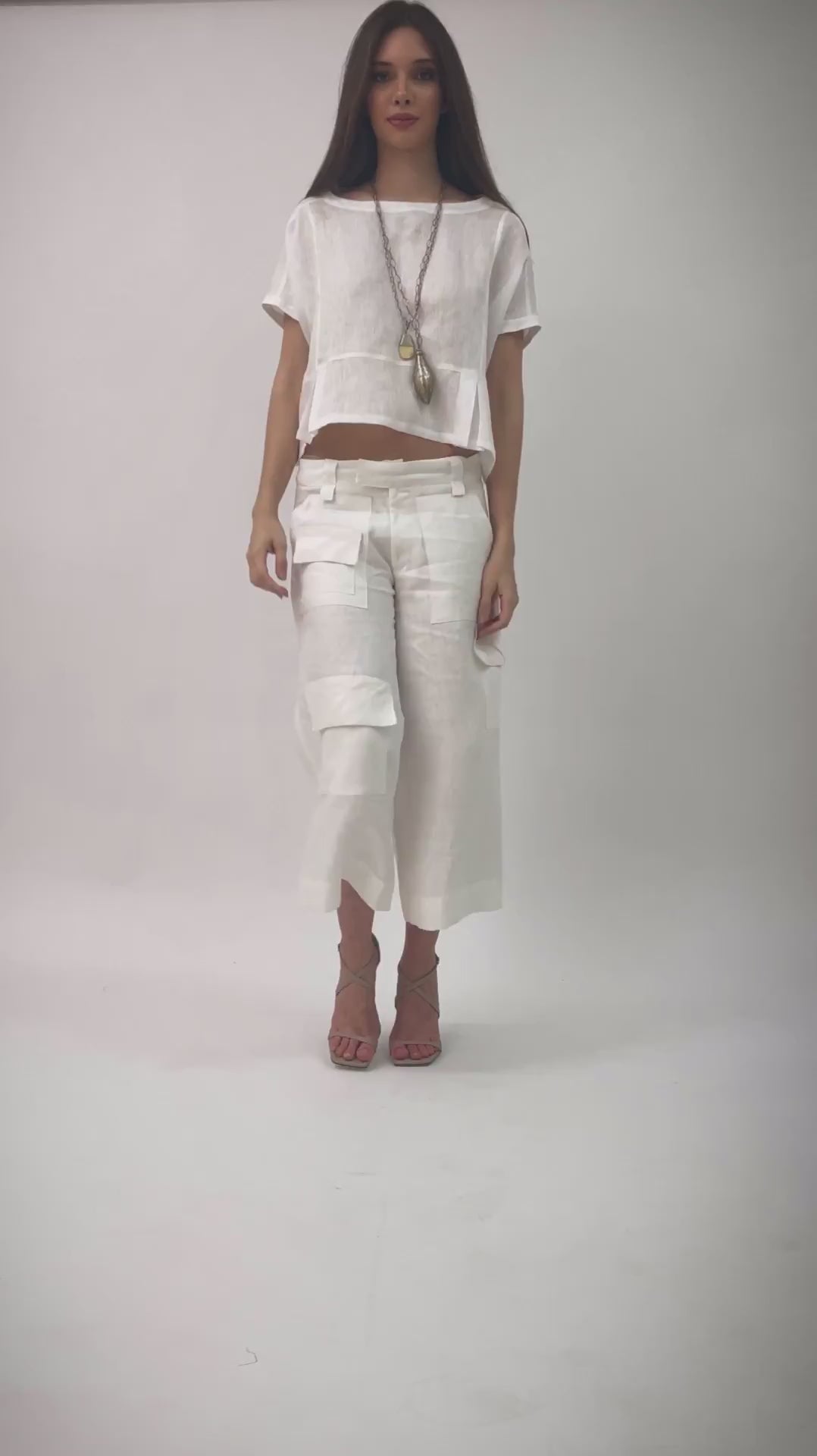 Calça cargo cropped 100% linho, uma fusão perfeita de estilo e conforto. Feita com tecido de linho puro, esta peça oferece leveza e frescor, tornando-a ideal para os dias mais quentes. O design cropped adiciona um toque contemporâneo, enquanto os bolsos cargo conferem um charme utilitário.